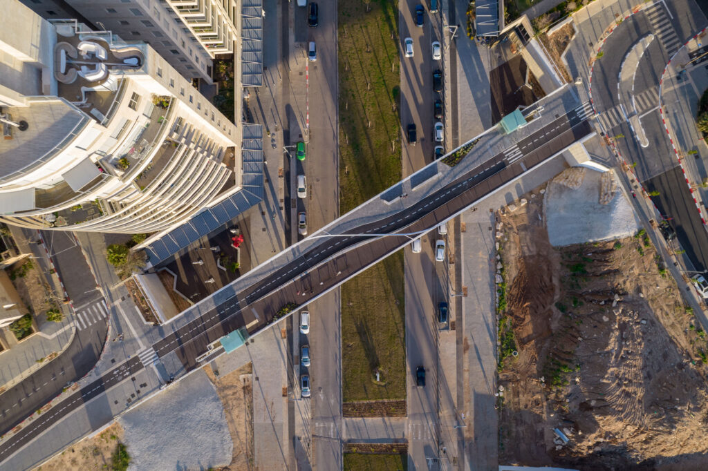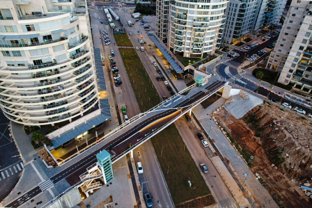 Nelly: I want to add how the concept of this bridge was born. I remember it was in 2017, Yoav, me, and Rivka were in that room, working on ideas. My dream was to create a 3D bridge, not a flat one. I wanted it to have two different levels, so when you drive on the road, you could see through it. And I remember, it was your idea, Yoav, to twist the bicycle path to create a wider area with space for benches on both sides. And also, you suggested placing the elevators and stairs inside the bridge, not outside.